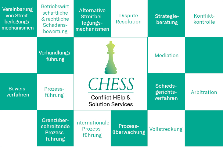 CHESS zeigt die im jeweiligen Stadium der Konfliktlösung anwendbaren Streitbeilegungs­mechanis­men auf. Wir streben vorrangig eine außergerichtliche Streitbeilegung an, denn sie ist – wenn Raum dafür besteht – schneller und kostengünstiger sowie oftmals einem kreativen Problem­lösungs­ansatz zugänglicher. Denn Gerichte und Schiedsgerichte können nur Urteile sprechen, also Sachverhalte bewerten und dann die hieraus entstehenden Rechtsfolgen ableiten.
