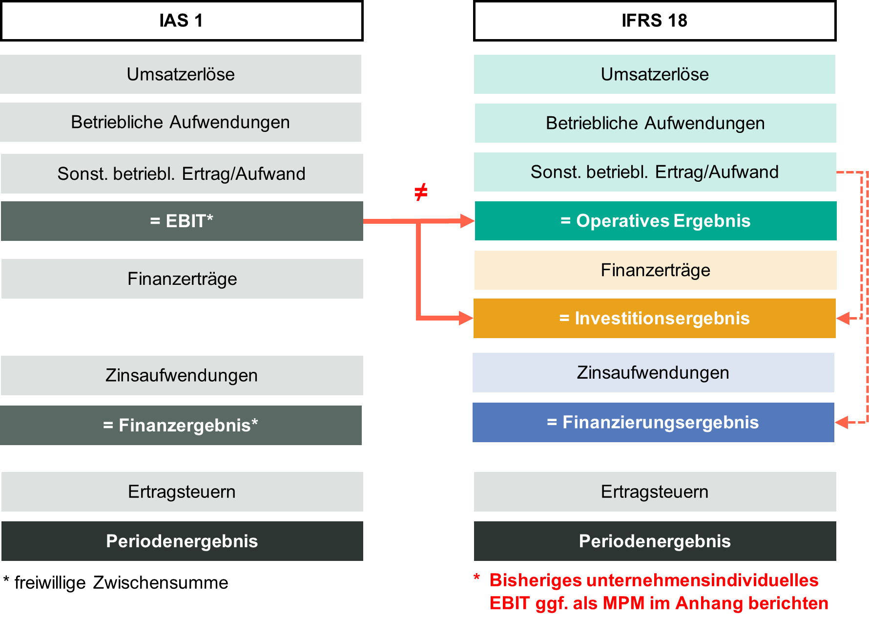 • ​Neue einheitliche Struktur der Gewinn- und Verlustrechnung mit drei neuen Kategorien Operatives Ergebnis, Investitionsergebnis und Finanzierungsergebnis sowie entsprechenden verpflichtenden Zwischensummen