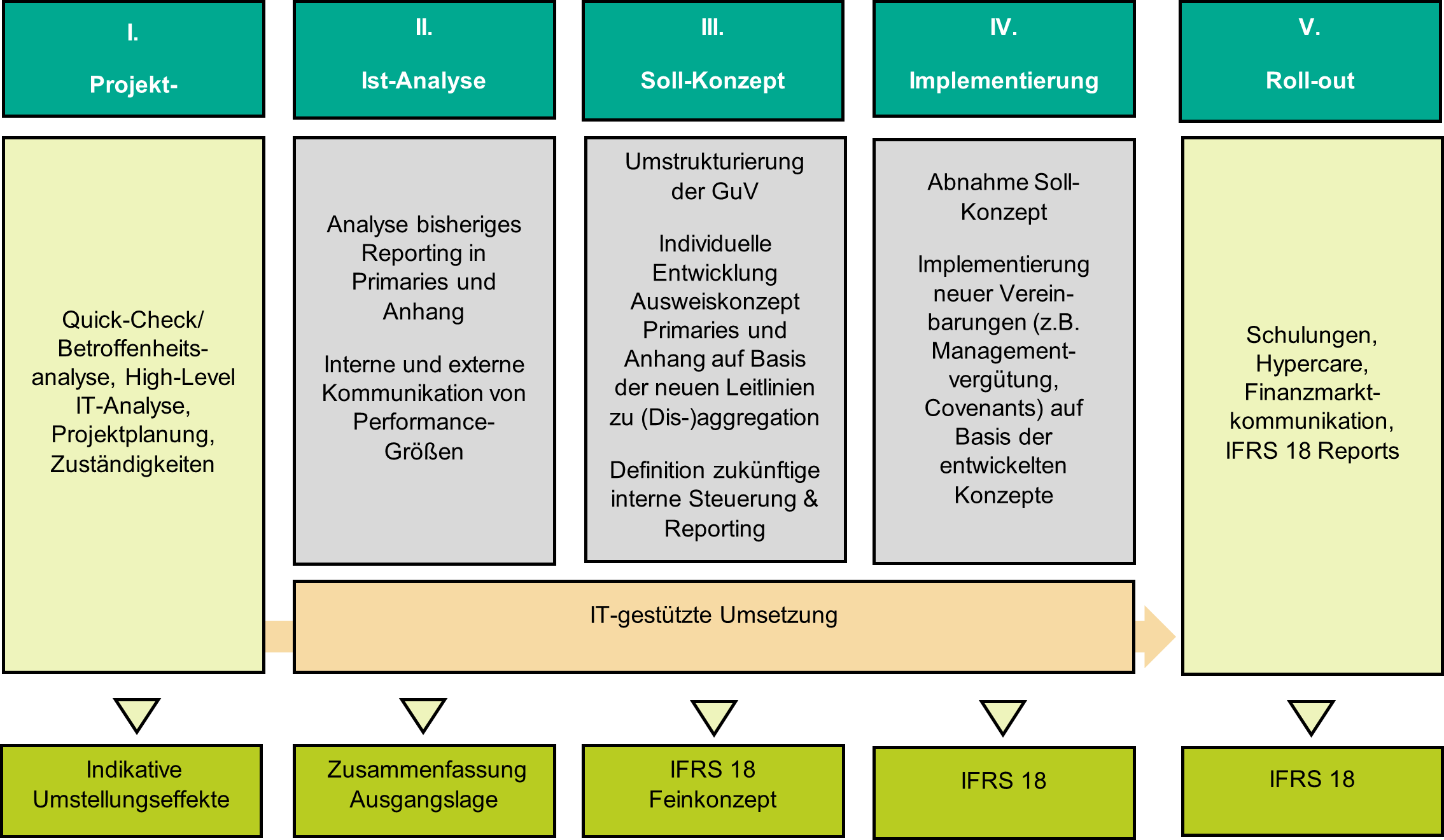 Unser interdisziplinärer Projektansatz (siehe Schaubild unten), der neben der fachlichen Ausarbeitung der Umstellung auf IFRS 18 insb. auch die IT-basierte Umsetzung miteinbezieht, sichert in fünf Schritten nicht nur eine effiziente Einführung des neuen Standards, sondern auch eine effiziente fortlaufende Erstellung IFRS 18-konformer Berichte nach der Implementierung.