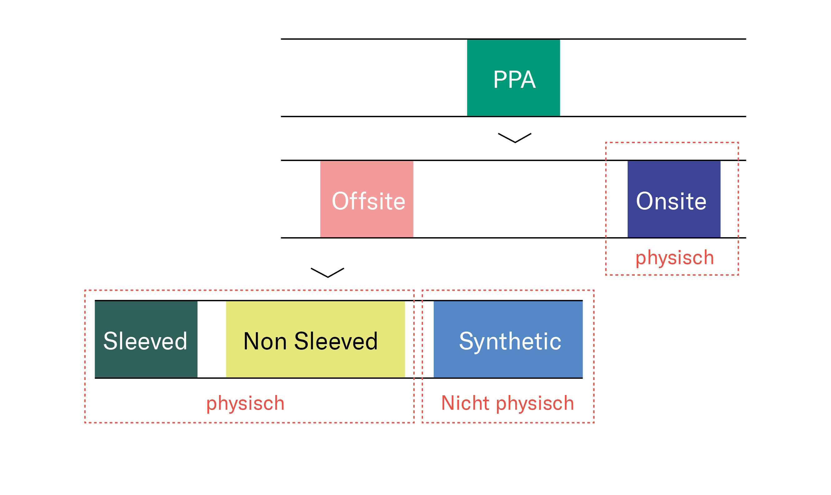 PPAs lassen sich in verschiedene Arten untergliedern.Es wird unterschieden zwischen physischen und virtuellen PPAs. Bei physischen PPAs ist vor allem noch eine Unterscheidung zwischen offsite bzw. sleeved und onsite PPAs notwendig. In der folgenden Grafik werden die diversen Formen dargestellt:
