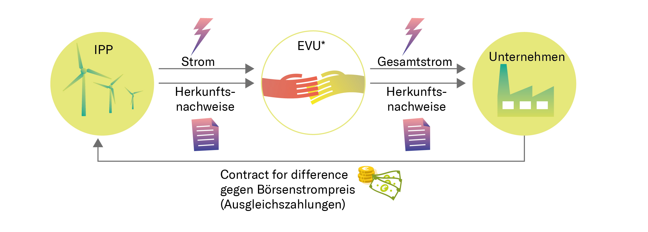 Ein virtuelles PPA hingegen ist als ein Finanzprodukt – ohne physische Strombelieferung – zu sehen. Ein PPA-Preis wird vertraglich festgelegt und darauf basierend gibt es Differenzzahlungen („Contract for difference”) zwischen dem PPA-Preis und dem dementsprechenden Börsenstrompreis. Zu beachten ist, dass die Lieferung des Stroms des EVUs unabhängig vom produzierten Strom des IPPs ist. Bei virtuellen PPAs können zudem noch Herkunftsnachweise überliefert werden.