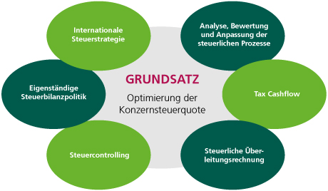 Mit Tax Accounting werden somit Analysen, Bewertungen und Anpassungen steuerlicher Prozesse zur Optimierung der Konzernsteuerquote möglich. Im Vordergrund der Maßnahmen steht jedoch eine international aufgestellte Steuerstrategie, durch die die Konzernsteuerlast reduziert werden kann.