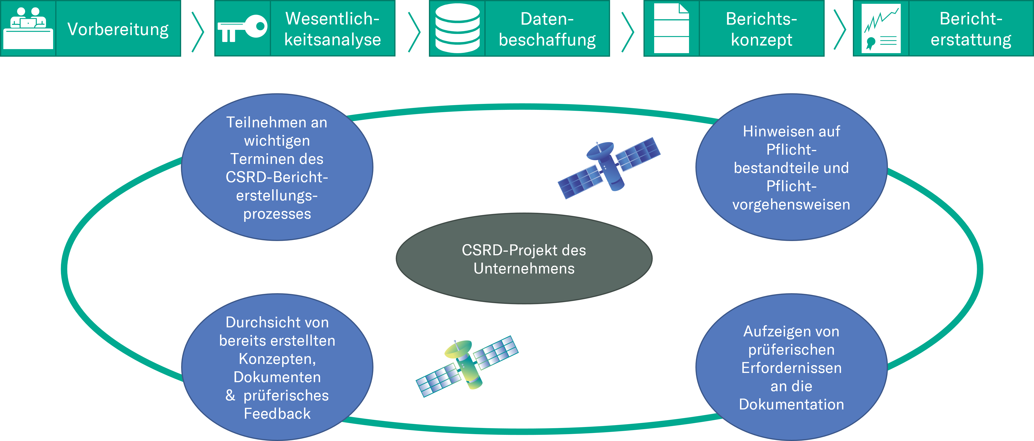 Die prüferische Begleitung beginnt bereits in der Vorbereitungsphase des Einführungsprojekts. Dabei werden die Projektpläne und das Scoping der Ersteller prüferisch auf den Einklang mit den Anforderungen der CSRD und ESRS geprüft. Hiernach folgt in der Regel der weichenstellende Schritt der Wesent­lichkeitsanalyse. Gerade in dieser Phase empfiehlt es sich, prüferisches Feedback zu Konzeption, Durchführung und den Ergebnissen zu erhalten, da die Wesent­lich­keits­analyse viele Parameter für die weiteren Schritte im CSRD-Berichts­­erstel­lungs­­prozess festlegt. Nach der Wesent­lichkeits­analyse müssen die notwendigen fachlichen Konzepte zur Datenerhebung erstellt und deren prozessuale Umsetzung vom Ersteller in Angriff genommen werden, gefolgt von der erstmaligen Datenerhebung im Rahmen von Testläufen und der Aufbau der Berichtsstruktur im Ein­klang mit den ESRS. In all diesen Phasen kann die projektbegleitende Prüfung Mehrwert für den Ersteller bringen und helfen, die Qualität der Nach­haltig­keits­bericht­erstat­tung noch vor der erstmaligen Veröffent­lichung zu verbessern. Die prüferische Begleitung kann zudem Synergien für die erstmalige verpflichtende Prüfung der Nachhaltigkeitsberichterstattung schaffen, da der Prüfer die Einführung der neuen Prozesse eng prüferisch begleitet hat, Prozessschwächen vor der eigentlichen Prüfung durch den Ersteller behoben werden konnten und so der Aufwand im Rahmen der erstmaligen Prüfung reduziert werden kann.