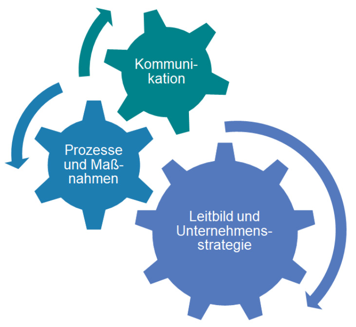Um das zu gewährleisten, ist es wesentlich die Verknüpfung der drei Elemente Strategie, Prozesse und Kommu­nikation bei einer Implementierung und Umsetzung eines CSR zu beachten. Die geeignete Kommuni­kation sorgt dafür, dass Strategie und Leitbild bei den Stakeholdern bekannt sind, was wiederum dazu führt, dass Prozesse in der Organisation verankert sind und die Maßnahmen mitgetragen und umgesetzt werden.