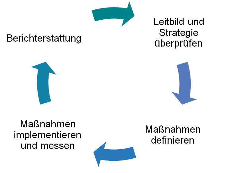 Dafür bietet sich die Einbettung des CSR in Anlehnung an einen kontinuierlichen Verbesserungsprozess an. Planung, Umsetzung, Berichterstattung und Überprüfung dessen stellen die wesentlichen Elemente dar.