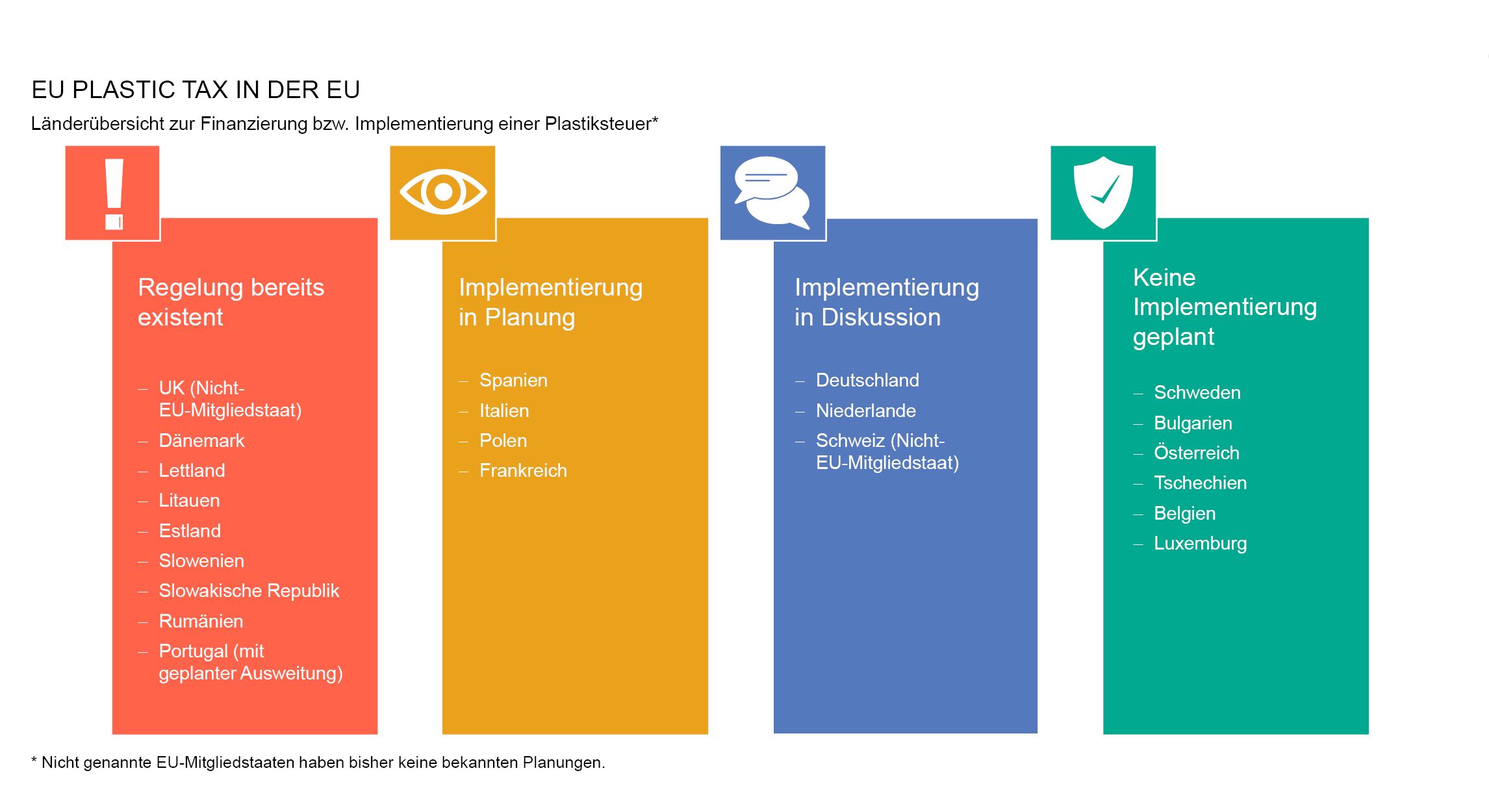 Die Herausforderung besteht zunächst darin, Informationen zu erhalten, in welchem Land eine Implemen­tie­rung oder Änderungen vorgenommen werden und wie in- und ausländische (Tochter-/Beteiligungs-) Unter­neh­men von etwaigen Melde- und Erklärungspflichten betroffen sind. Beispielsweise ist das nächste Land mit konkreten Plänen zur Umlage der EU-Plastikabgabe auf bestimmte Unternehmen Spanien zum Jahr 2023.