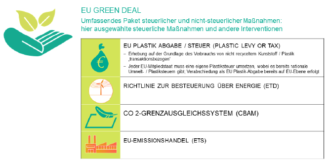 Seit Januar 2021 erhebt die Europäische Union (EU) bereits eine Plastik-/Kunststoffabgabe auf nicht recycelte Kunststoffverpackungsabfälle. Dies ist eine von mehreren Steuerreformen im Rahmen des EU Green Deal. Der Green Deal der EU ist ein Paket von politischen Initiativen, mit denen bis 2050 Klimaneutralität erreicht werden soll. Zu den Instrumenten, mit denen man die Klimaneutralität bis 2050 erreichen will, gehören der EU-Emissions­handel, die Kohlenstoffgrenzausgleichsmechanismen (CBMA), die Energiebesteuerungsrichtlinie und eben auch die Besteuerung von Plastik-/Kunststoffabfällen. Darüber hinaus sollen eine effizientere Ressour­cen­nutzung gefördert und ein sauberer Übergang zu einer Kreislauf-/Recyclingwirtschaft geschaffen werden.