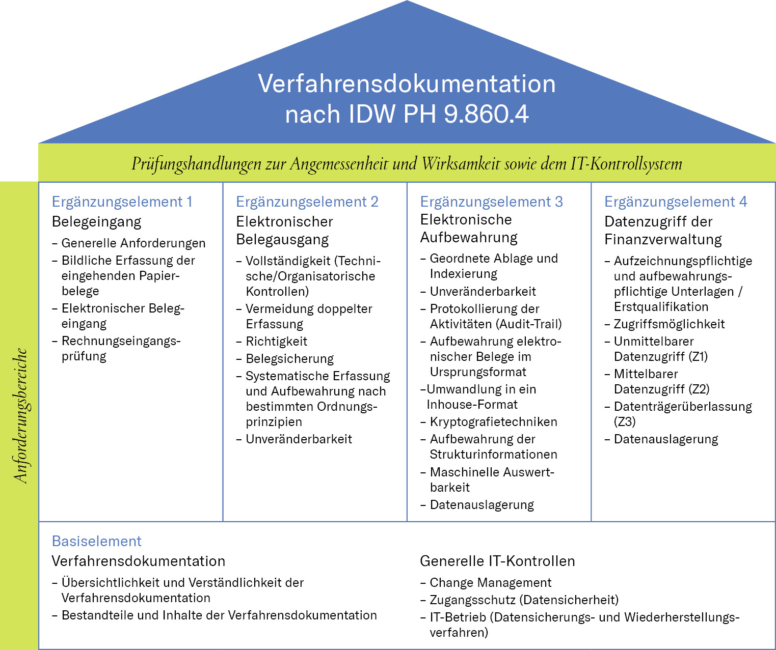 Die einzelnen Maßnahmen, die die Anforderungen der Finanzverwaltung umsetzen, und beispielhafte Prüfungshandlungen zur Angemessenheit und Wirksamkeit, sind in der Anlage 1 dieses Prüfungsstandards nach den folgenden Elementen unterteilt (siehe Abbildung).