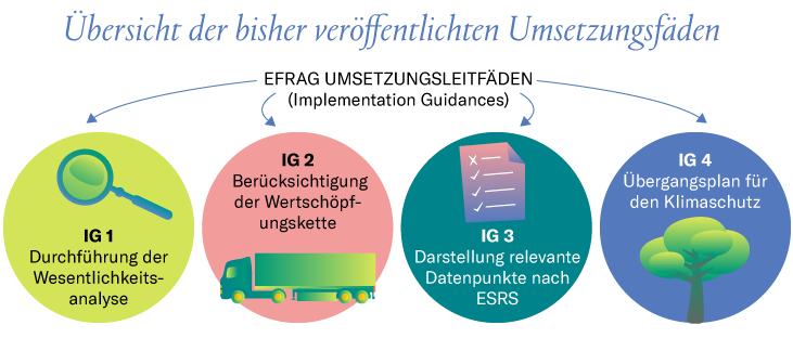 Im Rahmen der European Sustainability Renergy-plus-forum.aspx​eporting Standards (ESRS) ist die European Financial Reporting Advisory Group (EFRAG) als beratendes Gremium und Entwickler der ESRS von der Europäischen Kommission mit der Erstellung von Umsetzungsleitfäden („Implementation Guidance” – IG) beauftragt. Diese Umsetzungsleitfäden sollen Unternehmen zielgerichtet und zeitgerecht bei der Erstellung eines CSRD-konformen Nachhaltigkeitsberichtes unterstützen. Bei den Leitfäden handelt es sich jedoch explizit um eine nicht bindende Unterstützung.