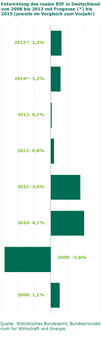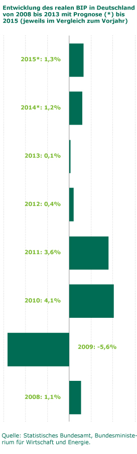 Die deutsche Wirtschaft ist Erfolg versprechend in das Jahr 2014 gestartet. Mit einem unerwartet starken Wachstum, das neben dem milden Winter auf eine gute Weltwirtschaftslage zurückgeführt wurde, waren die Konjunkturaussichten für 2014 und auch darüber hinaus positiv. Dies änderte sich ab dem 2. Quartal merklich, als das Wachstum überraschend nachließ und die Wirtschaft stagnierte. Seit dem unerwarteten Eintritt dieser Konjunktureintrübung wird deutlich pessimistischer auf die nähere Zukunft geschaut. Die Konjunkturerwartungen der Bundesregierung, der OECD und der Wirtschaftsweisen gehen für 2014 und 2015 für Deutschland nur noch von einem Wachstum von ca. 1 Prozent aus.​