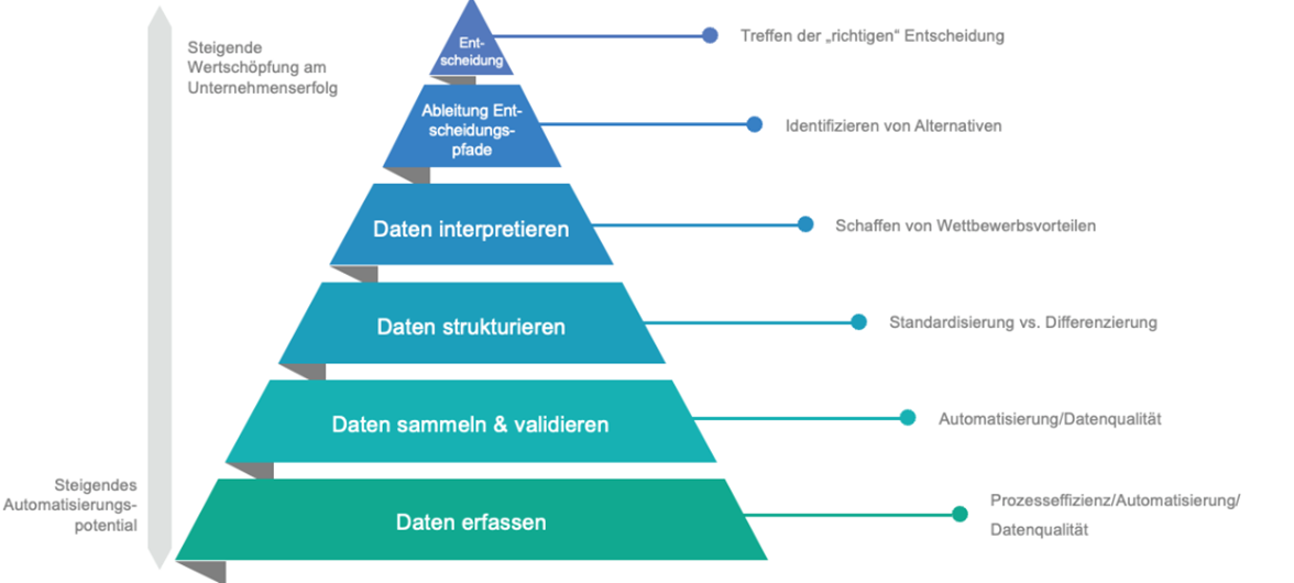 Die Data-Governance-Pyramide ist ein methodischer Ansatz, die den Weg von der Datenerfassung hin zur Entscheidungsunterstützung strukturiert. Zentraler Aspekt ist der hierarchische Aufbau der besagt, dass Themen wie Maschine Learning oder Künstliche Intelligenz erst dann sinnvoll anzugehen sind, wenn die darunter liegenden Ebenen fachlich und technisch sauber abgebildet wurden.