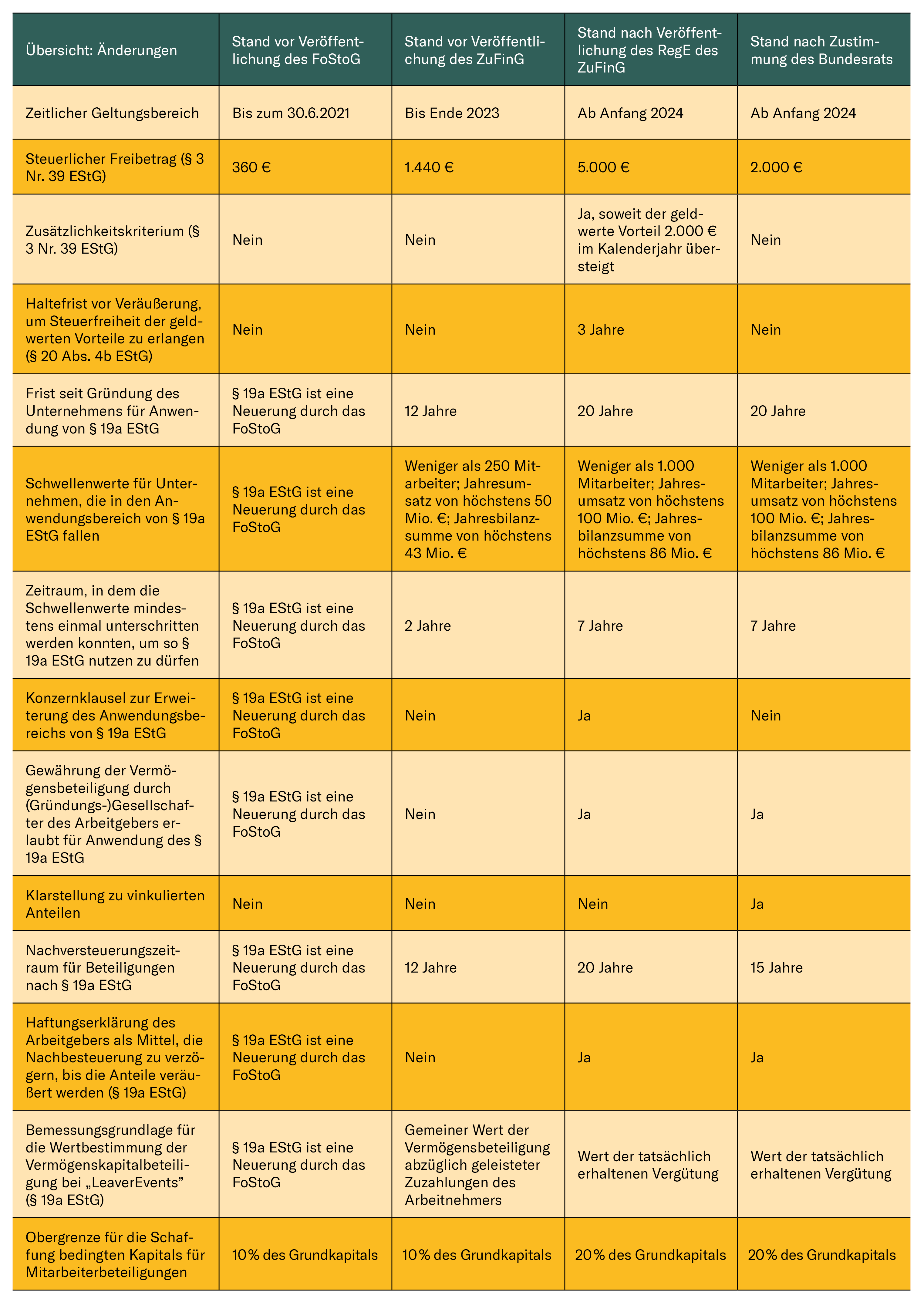 Im November 2023 wurden mit der Verabschiedung des Zukunftsfinanzierungs­ge­set­zes (ZuFinG) erneut die Spielregeln für die Besteuerung von Mitarbeiterbe­teiligungen geändert. Besonders die Start-up-Szene profitiert von den neuen Vorschriften. Schon im Koalitionsvertrag war die Absicht verankert, die Attraktivität von Mitarbeiterbetei­ligungen für Start-ups zu steigern. Diese Absicht soll nun mit dem Zukunftsfinan­zie­rungs­gesetz umgesetzt werden. Das Gesetzesvorhaben knüpft an das bereits 2021 beschlossene Fondstandortgesetz (FoStoG) an und verbessert an einigen Stellen die Praxistauglichkeit der Regelungen, bleibt jedoch an anderer Stelle weit hinter dem Erwarteten zurück oder verschlechtert es gar.