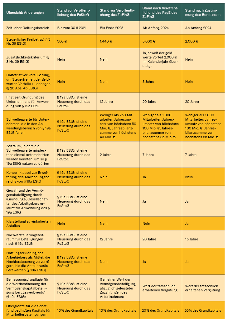 Des Weiteren werden die Regelungen zur aufgeschobenen Besteuerung der geldwerten Vorteile aus Vermö­gens­­beteiligungen von Arbeitnehmern gemäß § 19a EStG erweitert (s. hierzu die beigefügte Synopse, der alten, der geplanten und der neuen Rechtslage). Diese Änderungen verfolgen das Ziel, Start-ups sowie kleine und mittlere Unternehmen (KMU) zu unterstützen, indem die Anwerbung und Bindung von Mitarbeitern verbessert wird. Gleichzeitig soll die sogenannte "dry-income"-Problematik, bei der eine Besteuerung beim Mitarbeiter ohne Mittelzufluss erfolgt, für Arbeitnehmer abgemildert oder vermieden werden. Mit Verkündung des ZuFinG wird der Anwendungsbereich des § 19a EStG erweitert, um auch ältere und bereits etablierte Start-ups einzu­beziehen. Bisher fielen nur wenige Unternehmen unter diese Regelung, weshalb in der Praxis die nachgelagerte Besteuerung kaum genutzt wurde.