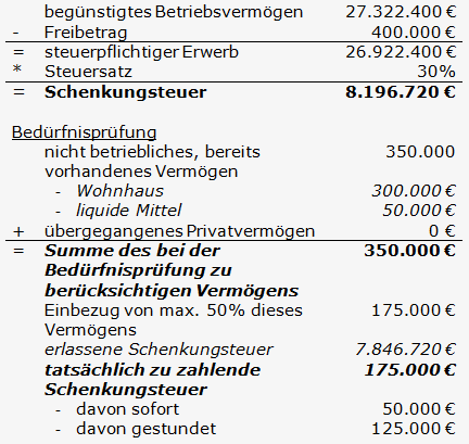 Nachdem der Wert des begünstigtem Vermögens über 20 Mio. Euro liegt, scheiden die bisherigen Verschonungsregelungen aus. Stattdessen ist eine Bedürfnisprüfung durchzuführen. Berechnung der tatsächlich zu zahlenden Schenkungsteuer: