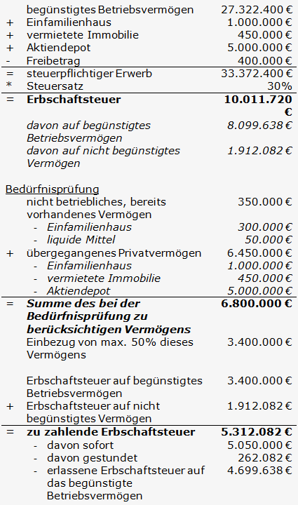 Nachdem der Wert des begünstigtem Vermögens über 20 Mio. Euro liegt, scheiden die bisherigen Verschonungsregelungen aus. Stattdessen ist eine Bedürfnisprüfung durchzuführen. Berechnung der tatsächlich zu zahlenden Erbschaftsteuer: