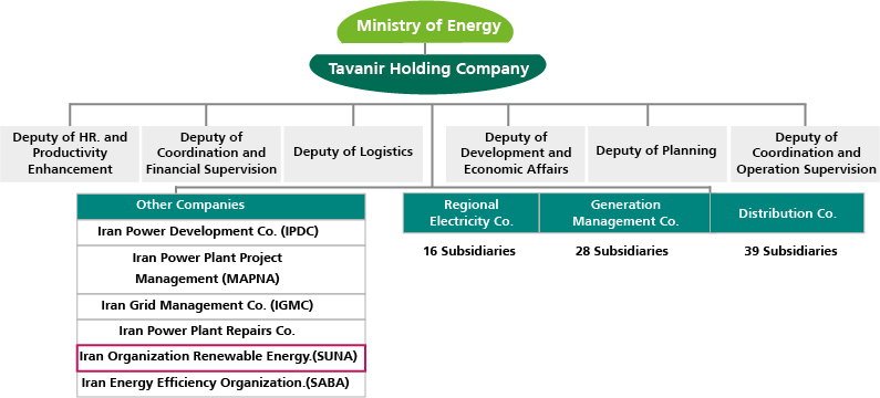 Die Elektrizitätsversorgung im Iran ist in staatlicher Hand und beim Ministerium für Energie angesiedelt, in das auch die staatliche Tavanir Holding Company eingegliedert ist. Zu den 5 Einrichtungen mit Sonderaufgaben zählt auch die öffentliche „Renewable Energy Organization of Iran” (SUNA), die für die Organisation und das Vorantreiben des Ausbaus der Erneuerbaren Energien verantwortlich ist.