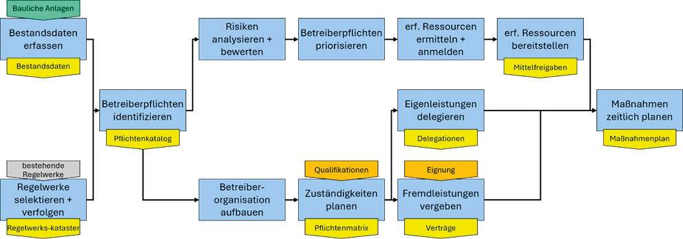 interne Koordinatoren und externe Dienstleister. Eine zentrale Rolle spielt dabei die Pflichten- bzw. Verantwortlichkeitsmatrix als verbindliches Steuerungsinstrument zur organisatorischen Verankerung. Sie sollte regelmäßig auf Aktualität und Wirksamkeit geprüft werden. Ergänzend sorgen Schulungen, definierte Eskalationswege und ein digitales Kompetenzmanagement (z. B. Qualifikationsdatenbank) dafür, dass alle Akteure ihre Kontroll- und Übernahmepflichten wirksam wahrnehmen können. Ob Betreiberpflichten intern erbracht oder extern vergeben werden, ist auf Grundlage von Eignung, Komplexität und Gefährdungslage zu entscheiden. Eigenleistungen bieten Vorteile bei Steuerung und Know-how, Fremdvergaben ermöglichen Skaleneffekte und Flexibilität. In jedem Fall müssen Verträge klare Regelungen zu Leistung, Qualifikation, Haftung und Dokumentation enthalten.