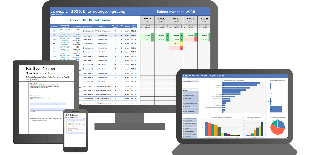 Für Organisationen ohne spezialisierte Software eignet sich auch eine Excel-basierte Lösung. Das REG-IS-Tool „Pflichtenkatalog“ unterstützt diesen Ansatz mit strukturierten Inhalten und einem Dashboard zur Filterung nach Gewerken, Tätigkeiten und Zuständigkeiten sowie weiteren Kriterien. Komplexe Zusammenhänge zwischen Pflichten, Maßnahmen und Risiken lassen sich so nachvollziehbar visualisieren. Anwender können z. B. alle Wartungspflichten für Aufzugsanlagen anzeigen, Verantwortlichkeiten zuordnen und dauerhaft mitfiltern. Das ist ein wichtiger Schritt zur konsistenten, revisionssicheren Aufgabenverteilung.
