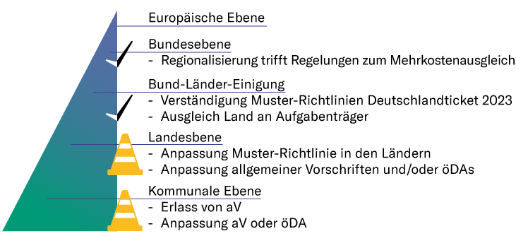 Als Grundlage für eine bundeseinheitliche Umsetzung des Deutschland-Tickets dient § 9 Absatz 1 des Regionalisierungsgesetzes (RegG) und die auf dieser Grundlage erarbeitete Musterrichtlinie des Bundes zur Anwendung des Deutschland-Tickets vom 20.3.2023, die wiederum auf Landesebene jeweils eine verbindliche Umsetzung erfordert. Der Umsetzungsprozess kann insoweit als (interessantes) Experiment verstanden werden, indem innerhalb von föderalen Zuständigkeitsregelungen eine bundeseinheitliche Regelung dezentral umgesetzt werden muss. Der Bund war sich der damit verbundenen Risiken bewusst und hat für die Anlaufphase eine sogenannte Tarifverpflichtung über das RegG geregelt. Diese ist bis zum 30.9.2023 befristet. Sie regelt für alle Unternehmen eine Anwendungsverpflichtung. Für die Aufgabenträger bedeutet dies, dass sie gehalten sind, spätestens mit Wirkung zum 1.10.2023 eigene Regelungen zu treffen, wenn die deutschlandweite Gültigkeit weiterhin sichergestellt werden soll.