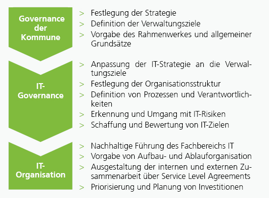 Diese Entwicklung bedingt, dass der Fachbereich IT über passende Strukturen die Möglichkeit erhält, diese Prozesse wirkungsvoll unterstützen zu können und so dem Thema Digitalisierung auf Augenhöhe angemessen begegnen kann. Die Schaffung dieser Rahmenbedingungen – also Maßnahmen zur Steuerung, Kontrolle und Organisation – wird unter dem Begriff IT-Governance subsumiert. Dabei ist IT-Governance nicht im Fachbereich IT angesiedelt, sondern als zentrale Aufgabe der Verwaltungsführung anzusehen. Die Ausgestaltung und Umsetzung erfolgt nach dem Top-down-Prinzip.