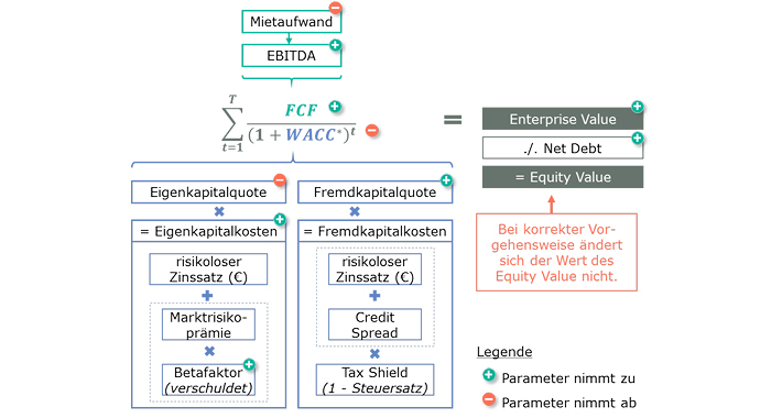 Durch die Änderungen nach IFRS 16 kommt es i.d.R. zu einem höheren Enterprise Value. Das liegt zum einen an einem höheren Free Cash Flow, da die Leasingaufwendungen nicht mehr als operative Aufwendungen erfasst werden und zum anderen an i.d.R. sinkenden gewichteten durchschnittlichen Kapitalkosten (WACC). Beide Effekte führen somit zu einem höheren Barwert der Zahlungsströme. Die veränderte Kapitalstruktur resultiert dabei aus dem höheren Verschuldungsgrad des Unternehmens bzw. der Peer Group aus der die Kapitalkosten im Wesentlichen abgeleitet werden.
