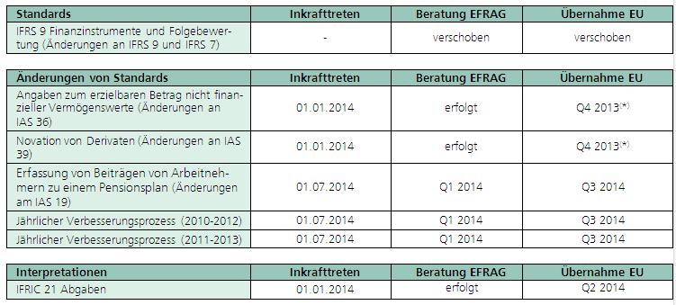 (*) Nach Redaktionsschluss wurden die Änderungen an IAS 36 und IAS 39 durch die EU übernommen. Damit sind diese Änderungen verpflichtend für Geschäftsjahre beginnend ab dem 01.01.2014 anzuwenden.