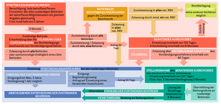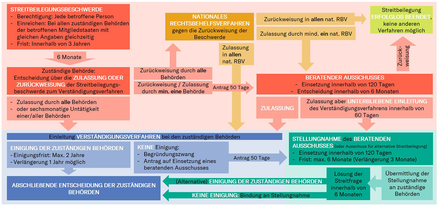 Darüber hinaus ist eine Überprüfung des Steuerbescheids nach nationalen Rechtsbehelfen zu jedem Zeitpunkt des Verfahrens nach der EU-Streitbeilegungsrichtlinie möglich. Jedoch ist das Führen eines nationalen Rechtsbehelfsverfahrens gegen den Steuerbescheid und eines EU-Streitbeilegungsverfahrens nicht parallel möglich. In diesen Fällen ruht das Streitbeilegungsverfahren, bis das Rechtsbehelfsverfahren beendet wurde bzw. es kann auch das Ruhen des nationalen Verfahrens angeordnet werden.