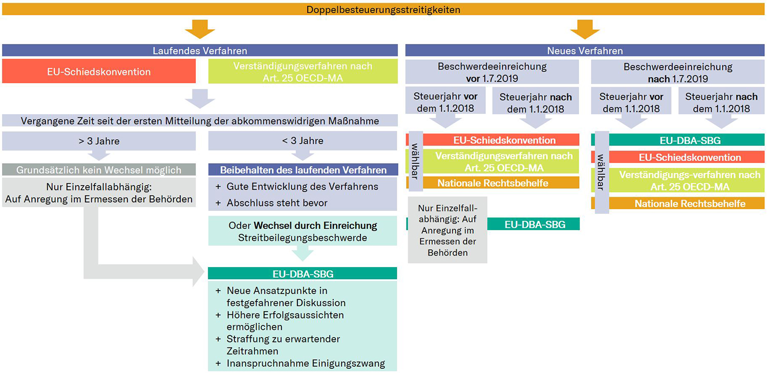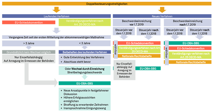 Findet bereits ein laufendes Verständigungs- oder Schiedsverfahren nach DBA oder EU-Schiedskonvention statt, ist ein Wechsel in das EU-Streitbeilegungsverfahren denkbar, wenn dessen Voraus­setzungen erfüllt sind (insb. zeitlicher Anwendungsbereich und Fristen). Dabei kann ein Wechsel insbesondere in Erwägung gezogen werden, wenn es sich um ein erst seit Kurzem laufendes Verfahren handelt. Darüber hinaus ist ein Wechsel möglich, um einen neuen Ansatzpunkt und damit höhere Erfolgsaussichten zu ermöglichen, wenn die Diskussion im laufenden Verfahren festgefahren ist. Eine Lösung für sehr langlaufende Verfahren scheitert grundsätzlich an den Fristen für die Einlegung der Streitbeilegungsbeschwerde, es sei denn, die beteiligten Behörden würden einer Anregung zum Wechsel in das EU-Streitbeilegungsverfahren folgen. Von einem Wechsel sollte abgesehen werden, wenn das Verfahren sich gut entwickelt und kurz vor dem Abschluss steht. Wird ein Wechsel in Erwägung gezogen, sollte beachtet werden, dass das laufende Verfahren beendet wird und das Streitbeilegungsverfahren wieder völlig von vorn beginnt. Eine Rückoption ist dann nicht mehr möglich.