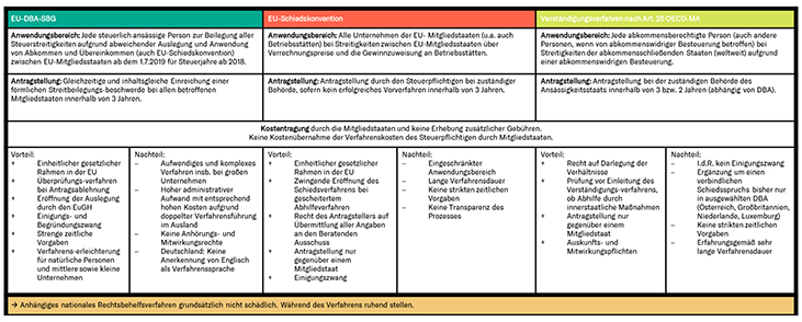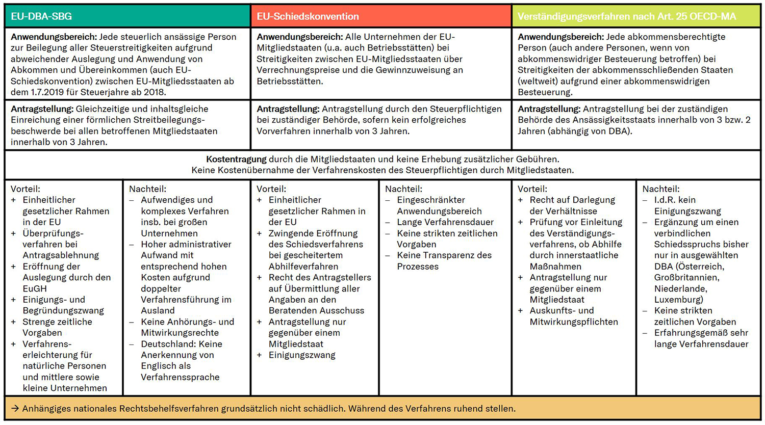 Für die Zukunft stellt sich für den Steuerpflichtigen in einem Doppelbesteuerungskonflikt die Frage, welchen Verfahrensweg er bestreiten will. Dabei kann er je nach Einzelfall zwischen der EU-Schiedskonvention, dem Verständigungsverfahren nach Art. 25 OECD-MA, nationalen Rechtsbehelfen oder der EU-Streitbeilegungs­richtlinie wählen.