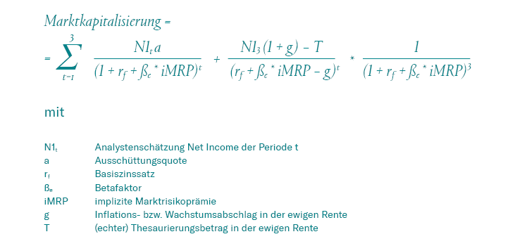 Als letzte Variable und damit als Residualgröße verbleibt im Bewertungsmodell die Marktrisikoprämie. Die Auflösung der Bewertungsgleichung nach der Marktrisikoprämie führt im Ergebnis zur impliziten Marktrisiko­prämie, die, gegeben alle anderen Inputparameter, zu der am Untersuchungsstichtag beobachtbaren Markt­ka­pi­ta­li­sierung (Equity Value) führt. In der Praxis erfolgt dies iterativ in Microsoft Excel.