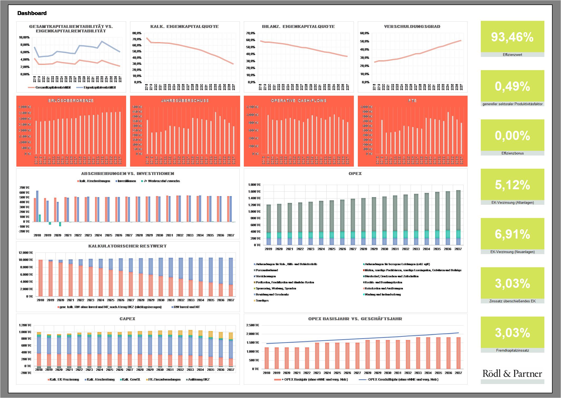 In einem zweiten Dashboard werden die Auswirkungen auf ausgewählte Kennzahlen durch Variation der zukünftigen Investitionshöhe, Anerkennung der Netzkosten, Höhe der Eigenkapital- und Fremdkapitalzinssätze sowie die Veränderung der regulatorischen Größen dargestellt. Der Anwender kann so die Auswirkungen einzelner Maßnahmen oder ihrer Gesamtheit erkennen und den für ihn optimalen Maßnahmenplan im Hinblick auf die Kostenprüfung, die Ergebnis- bzw. Vermögensentwicklung sowie den Finanzbedarf ableiten.
