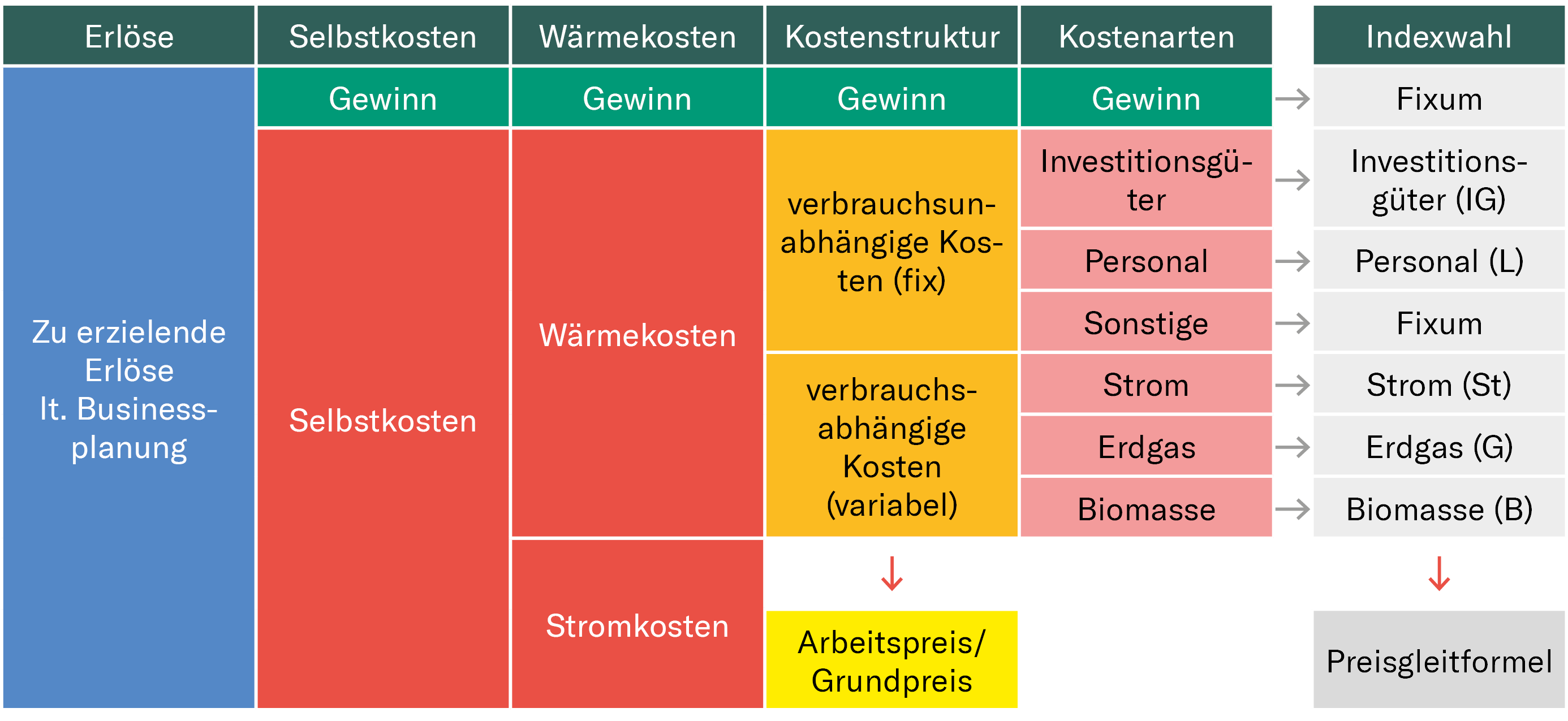 Im Gegensatz zur Fernwärme sind die Stromerlöse marktbedingt und durch das gesetzliche Förderregime bestimmt und nur zu einem geringen Teil vom Versorger selbst beeinflussbar. Die Fernwärmepreisbestimmung hingegen erfolgt, innerhalb der Vorgaben der AVBFernwärmeV, durch das Fernwärmeversorgungsunternehmen selbst und wirkt ausschließlich auf den jeweiligen regionalen Markt. Für die Ermittlung der Preishöhe und insbesondere der Preisgleitklausel in der Fernwärme ist es vor diesem Hintergrund essenziell, transparent und nachvollziehbar nur die der Wärme zugeteilten Kosten an den Endverbraucher weiterzugeben.