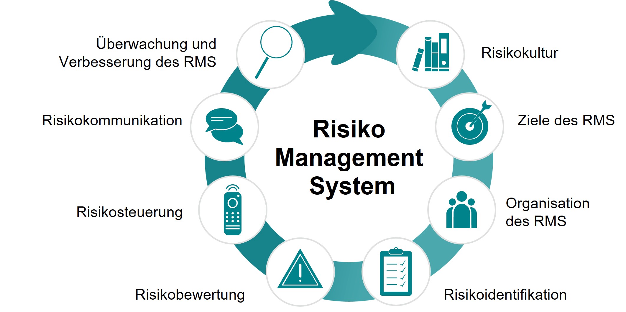 Zur Orientierung bei der Implementierung eines RMS werden von Unternehmen einschlägige Standards wie die ISO 31000 und IDW PS 981 herangezogen. Letztere beschreibt den Aufbau eines RMS anhand von acht grund­legenden Komponenten:
