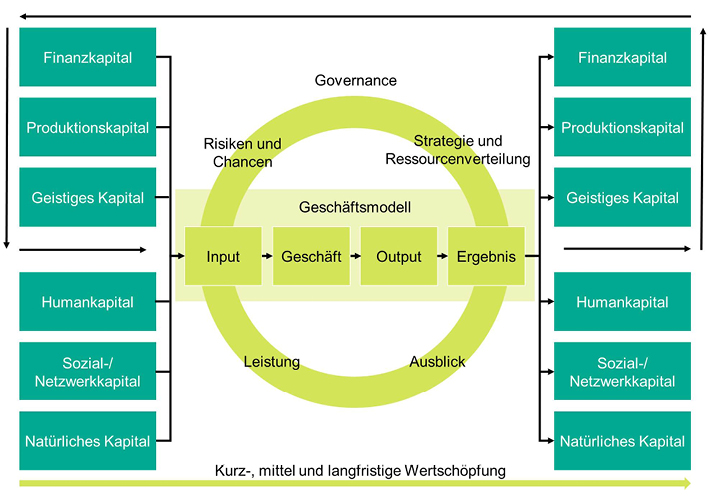 Durch den Wertschöpfungsprozess werden die Kapitalarten erhöht, verringert oder anderweitig verändert. Durch eine Investition in Mitarbeiterschulungen wird bspw. Finanzkapital in Humankapital umgewandelt. Daneben sind bei der Beschreibung der Wertschöpfung weitere Faktoren wie Chancen und Risiken, finanzielle Leistung und Zukunftsaussichten zu berücksichtigen. Entscheidend für eine erfolgreiche integrierte Bericht­erstattung ist damit, dass das Unternehmen die Beziehungen zwischen den Funktionseinheiten und den Kapital­arten aktiv berücksichtigt. Das IIRC spricht in diesem Zusammenhang von „Integrated Thinking”, das als Voraussetzung für ein gelungenes Integrated Reporting angesehen wird. Der Bericht ist damit letztlich nur die Abbildung einer integrierten Unternehmenssteuerung, die alle wesentlichen Aspekte bereichs­übergreifend entlang des Wertschöpfungs­prozesses berücksichtigt.