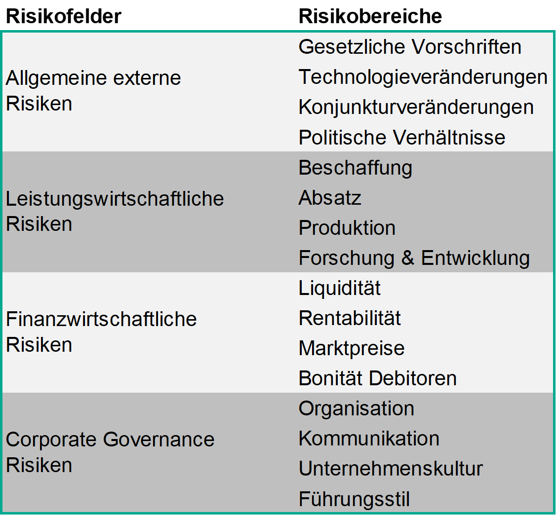 Die Krisenfrüherkennung sollte als integriertes System aufgebaut sein. Ein solches System erfordert eine methodisch fundierte Risikoidentifikation, -bewertung und -aggregation. Die Risikoidentifikation ist das Grundelement eines Frühwarnsystems und umfasst die regelmäßige und systematische Identifizierung von Risiken, die einzeln oder im Zusammenwirken mit anderen Risiken zu bestandsgefährdenden Entwicklungen führen können. Für eine vollständige Übersicht der identifizierten Risiken sollten diese in einem sogenannten Risikoinventar dokumentiert werden. Die Identifikation von Risiken sollte sich dabei nicht nur auf unternehmensinterne Bereiche beschränken, sondern auch volkswirtschaftliche und branchenspezifische Entwicklungen berücksichtigen. Eine mögliche Vorgehensweise zur Strukturierung der Risikoidentifikation ist die Bildung einer Projektgruppe, die im Rahmen von Workshops ein Risikoschema mit einzelnen Risikofeldern erarbeitet. Die Risikofelder werden dann mit den entsprechenden Organisationseinheiten tiefergehend analysiert und in Risikobereiche aufgeteilt (siehe Abbildung 1). Von entscheidender Bedeutung ist neben der Wahl geeigneter Instrumente eine Zuordnung von Verantwortlichkeiten zu den einzelnen Risikobereichen und -feldern.