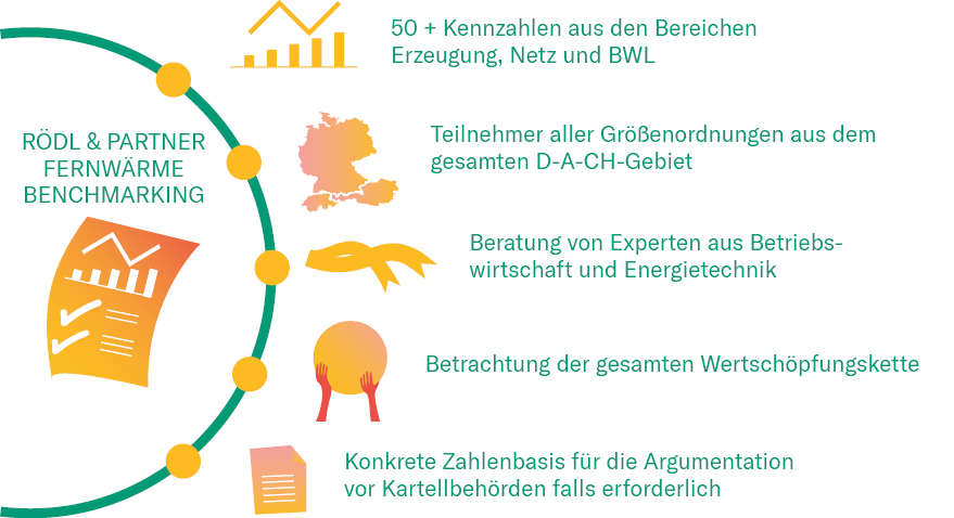Aufbauend auf der langjährigen Benchmarking-Erfahrung im Bereich der Wasserversorgung, hat Rödl & Partner bereits 2017 ein freiwilliges Benchmarking für Fernwärme entwickelt. Durch die direkte Gegenüberstellung mit anderen Marktteilnehmern werden Optimierungspotenziale aufgedeckt, aber auch eine Argumentationsgrundlage für etwaige kartellrechtliche Auseinandersetzungen erarbeitet. Daneben werden Möglichkeiten zur Modernisierung bestehender Strukturen erkennbar, langfristige Kosteneinsparungspotenziale identifizierbar und innovative und langfristige Versorgungslösungen umzusetzen. Die fortfolgende Grafik zeigt die Qualitätsmerkmale des Benchmarking im Bereich Fernwärme.