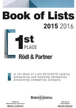 Rödl & Partner Poland was number 1 in the ranking of “Audit and accounting companies” in the category of "Accounting firms" and number 2 in the ranking of Business Process Outsourcing (BPO) providers specialised in finance & accounting and HR & payroll. In the ranking of “Tax advisory companies” (category: large enterprises) Rödl & Partner was listed 4th place and 6th place in in the ranking of “International law firms”.