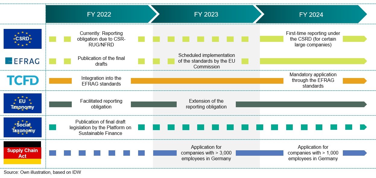 In the area of sustainability reporting, the range of legal changes and associated reporting requirements is constantly increasing. Nowadays, hardly any company can ignore terms such as CSRD, ESRS, EU taxonomy, etc., and early and targeted prepa­ration for the upcoming reporting requirements is indispensable if only to maintain competitiveness and avoid damage to the company's image. The imple­men­tation of the requirements, such as the establishment of processes, the determination of respon­sible persons or the selection of tools for data collection, requires an amount of time that should not be underestimated. First of all, decision-makers need to know exactly what reporting requirements their own company will have to meet in the future. In the following, we would therefore like to give you a brief overview of the current regulatory developments and the players involved.