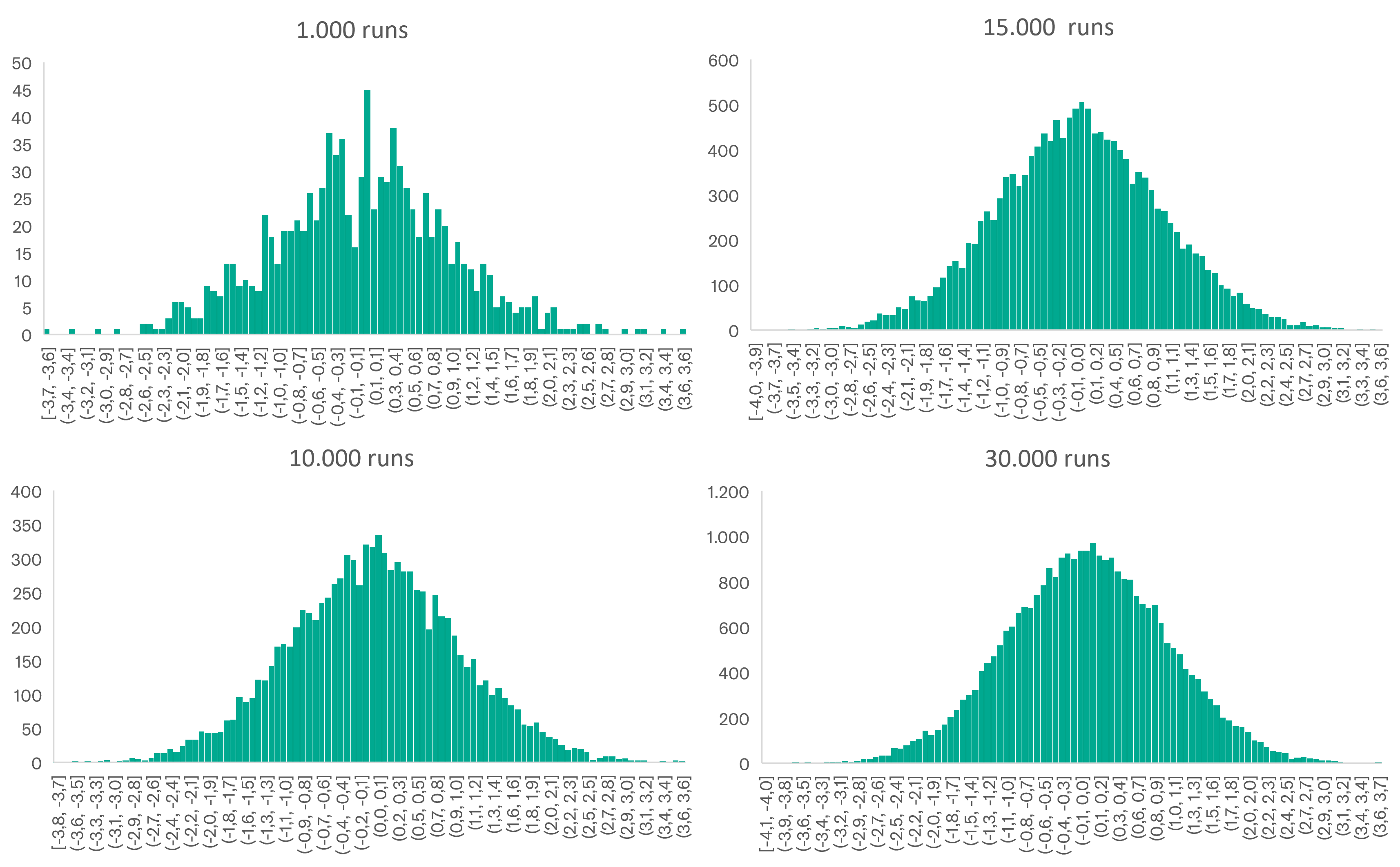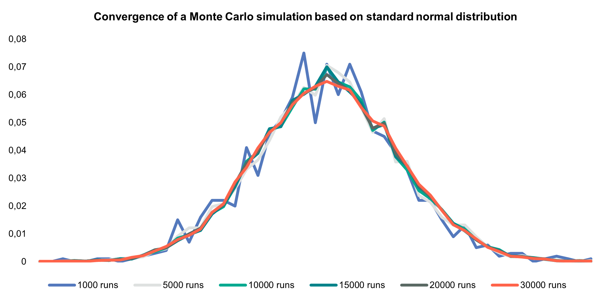 For a Monte Carlo simulation to deliver a meaningful result, usually at least 5,000 to 10,000 runs have to be performed.