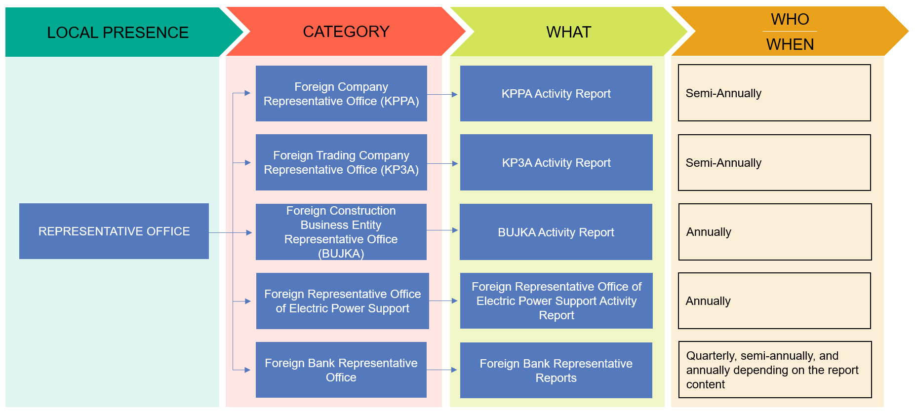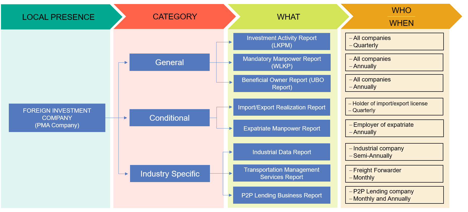 Once an investor has successfully established a local presence in Indonesia, they are required to perform ongoing compliance measures of different forms which will vary depending on the type of presence (i.e. Foreign Investment Company or Representative Office), on the satisfaction of certain conditions and on their specific business activities.