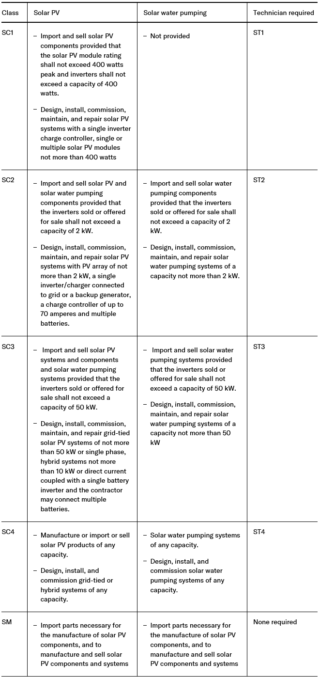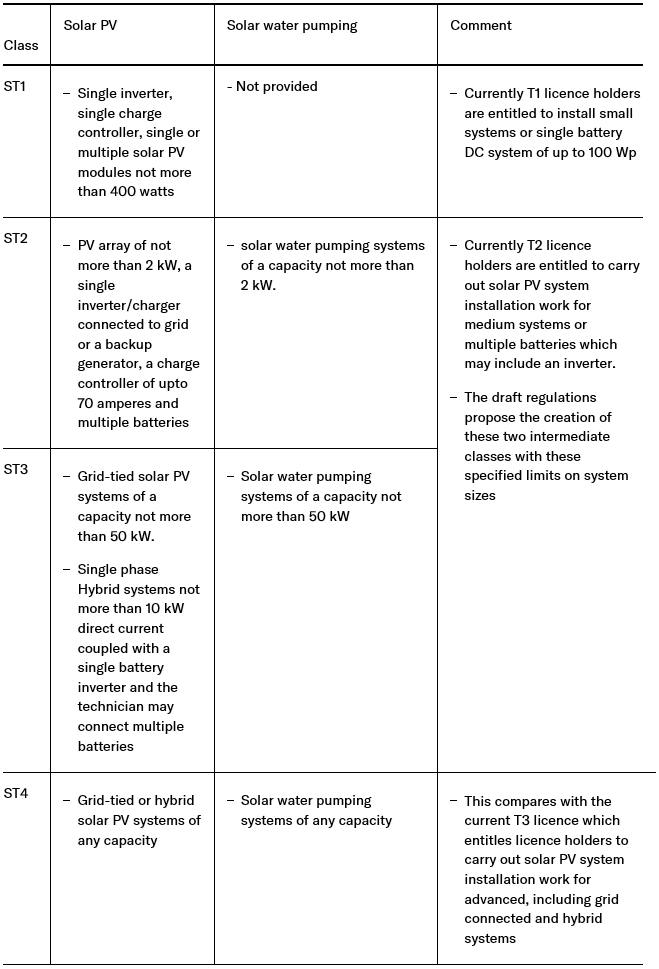 The new classes will enable solar PV technicians to design, install, commission, maintain, and repair solar PV systems and solar water pumping systems of sizes and capacities as follows: