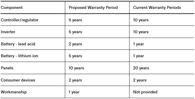 These adjustments are proposed in order to match the standard warranty periods being offered by manufacturers. To take one example, solar panels were required to be provided with 20 year warranties. This is proposed to be revised downwards to 10 years, which matches the 10-12 year warranty periods offered by most manufacturers.