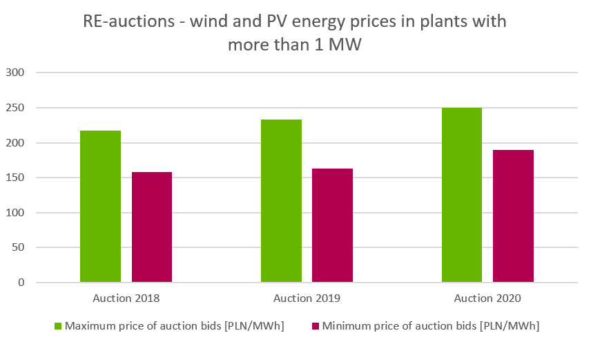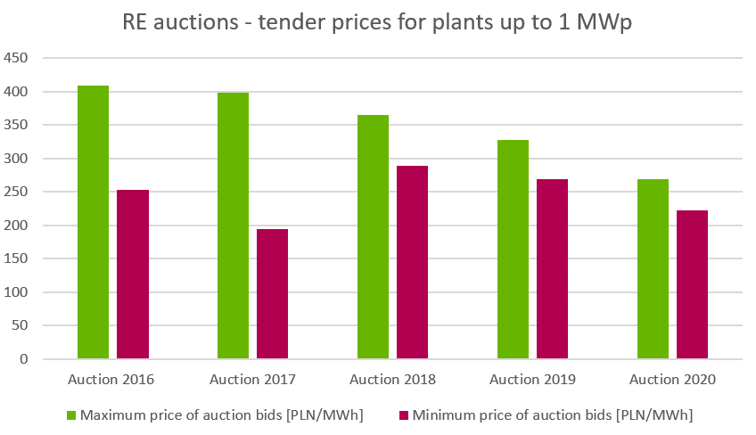In the auction basket for photovoltaic plants and wind turbines up to 1 MW, 590 producers submitted a total of 1618 bids. All bids were submitted for photovoltaic plants. Only 747 bids from 235 producers developing plants with a total capacity of 700 MWp were accepted. The very high competition in the basket under review led to a significant decrease in auction prices compared to previous years. According to the data of the Energy Regulator, the minimum price of successful auction bids in 2020 was PLN 222.87/MWh [approx. 4.9 eurcent/kWh] and the maximum price was PLN 268.88/MWh [5.9 eurcent/kWh]. By comparison, in the previous year, in the same auction basket, the minimum price achieved in the auction was PLN 269.00/MWh [6 eurcent/kWh] and the maximum price was PLN 327.00/MWh [7.2 eurcent/kWh]. The highest bid submitted that would win the 2020 tender round was thus lower than the lowest accepted bid in the 2019 tender round. The downward trend in auction prices achieved had been observed since the first tender in 2016, but such a significant drop in auction prices was very surprising.