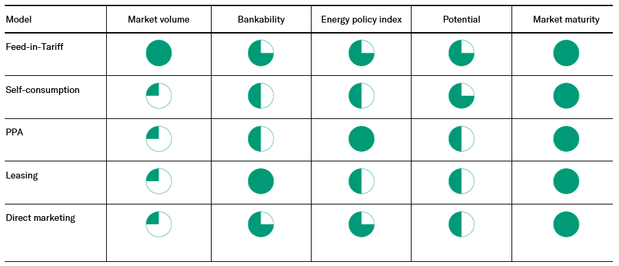 This model is especially suitable for service providers in the tertiary and industrial sectors because, in those sectors, production times match consumption times in most cases. Due to the lack of storage facilities, this model is still less suitable for private consumption. But in view of the constant development of technical storage capacities, this problem might be eased in the future. Due to declining acquisition costs and inexorable technical progress the number of electricity self-suppliers is rather expected to grow. In southern regions, power plants operating under this model have already become financially viable without state subsidies.